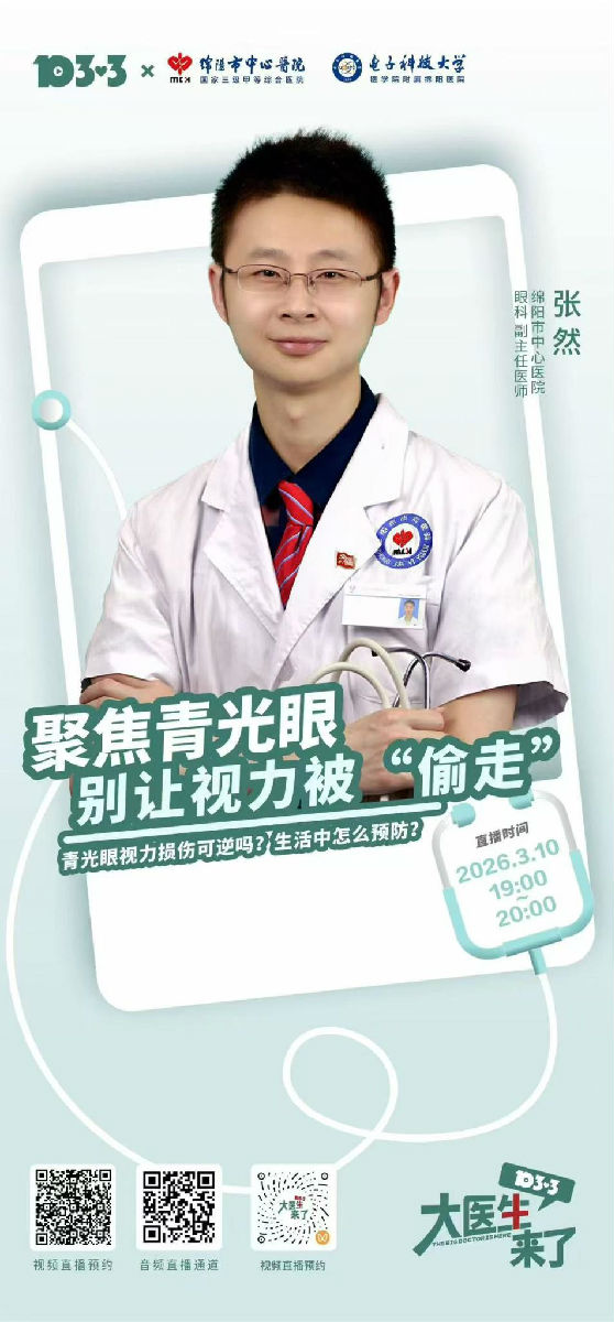 为了让更多市民足不出户就能获取权威的青光眼防治知识,3月10日,绵阳市中心医院眼科张然副主任医师受邀走进了绵阳广播电视台FM103.3“大医生来了”直播间,开展了一场主题为《聚焦青光眼,别让视力被“偷”走》的专题科普直播。张然医生用通俗易懂的语言,向听众揭秘了青光眼为何被称为“沉默的视力小偷”,详细讲解了其早期症状、高危人群以及定期筛查的重要性,并在线与听众互动,解答了大家关心的热点问题,节目收听率颇高,反响热烈。